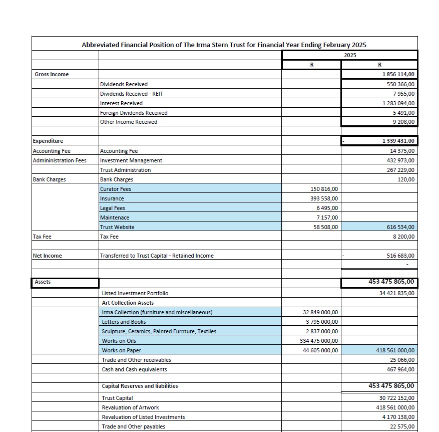 Abbreviated Financial Position of Irma Stern Trust at end February 2025